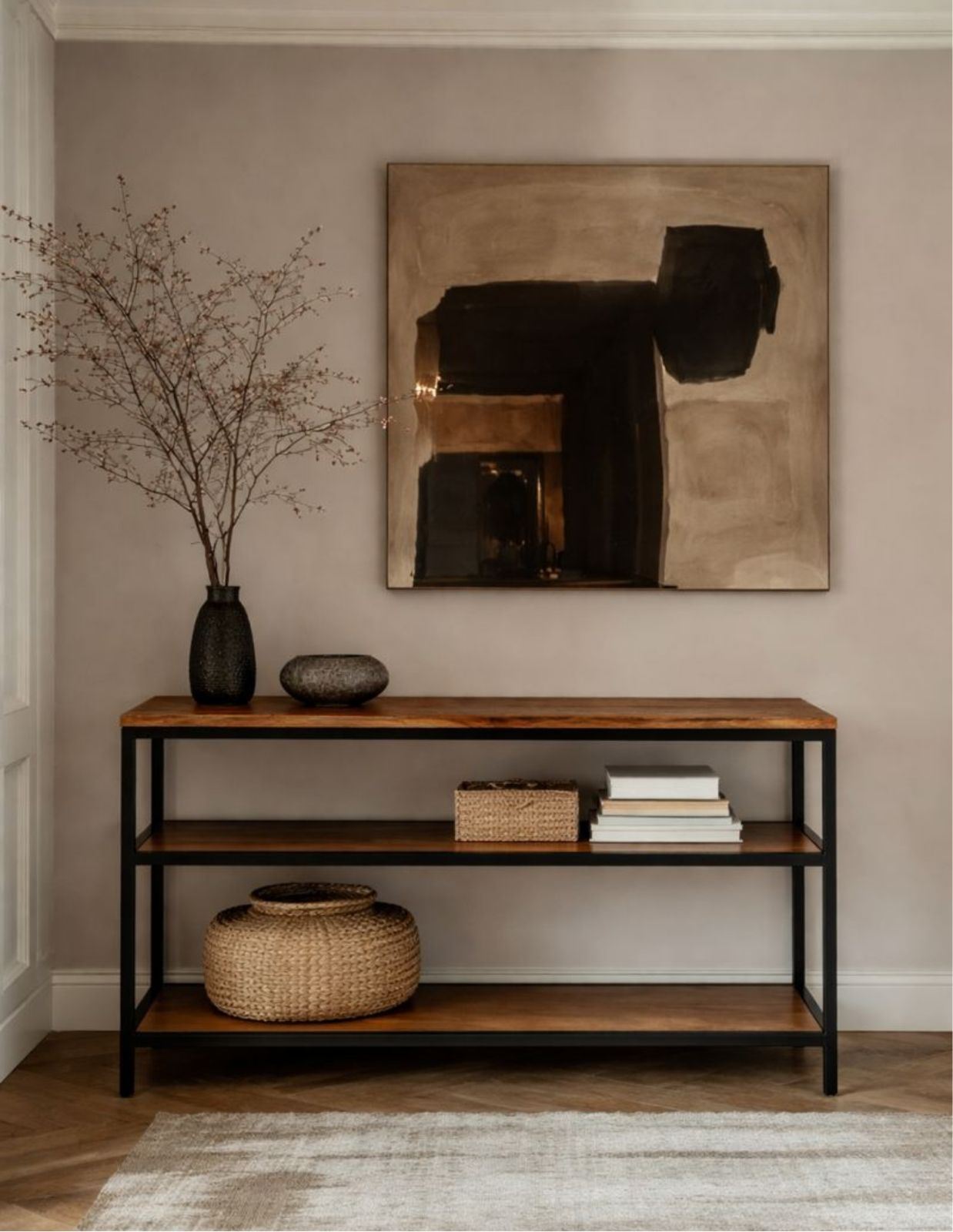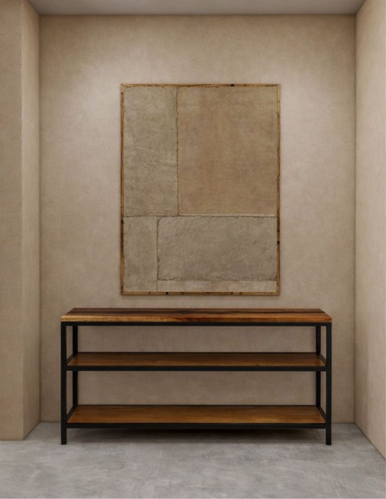 Credenza con 3 repisas de madera de parota sólida, cubierta de parota con río de resina epóxica, color a elegir. Base hecha de herrería.