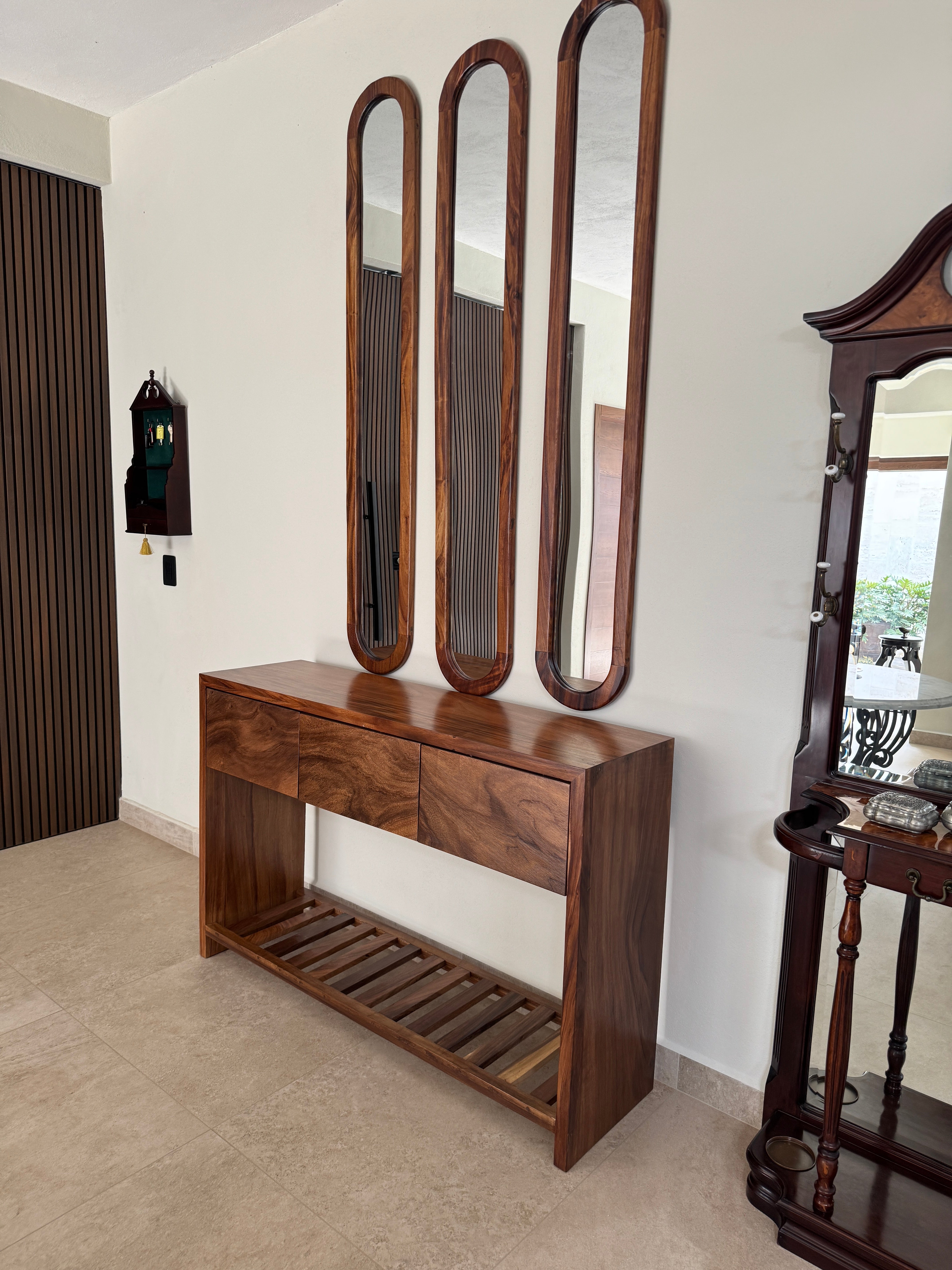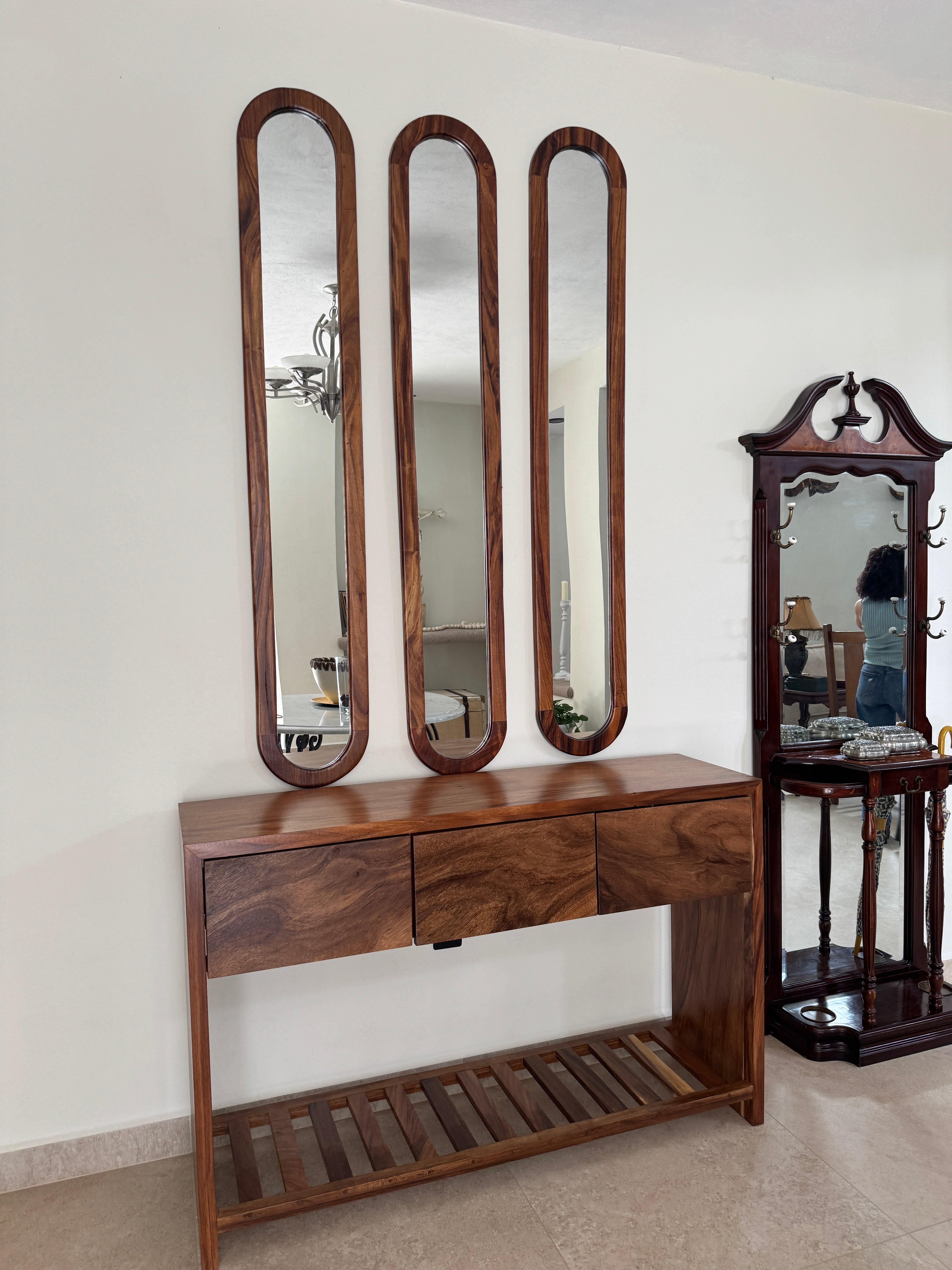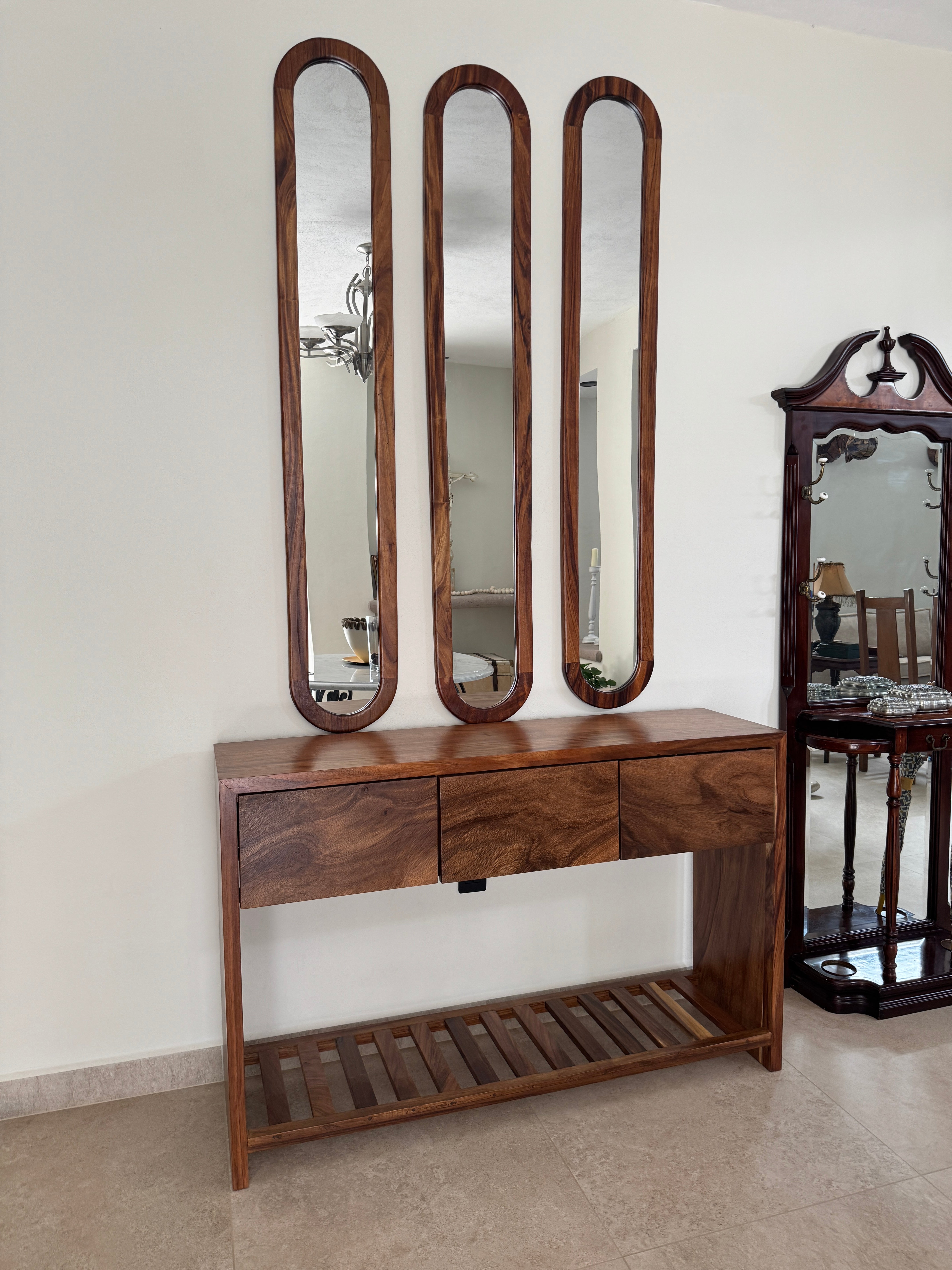 Credenza madera de parota sólida con repisa inferior con diseño de fajillas, en conjunto con nuestro set de espejos mediterráneos de 3 piezas de marco de madera sólida.